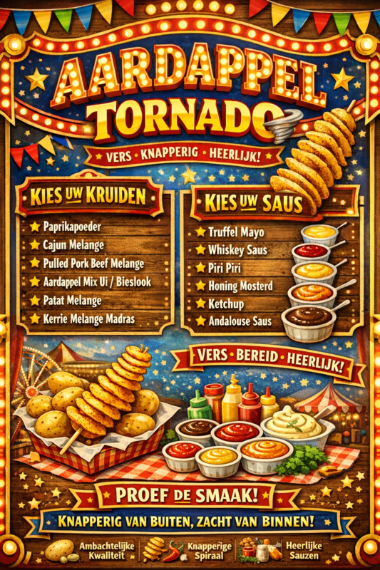 Maak van uw evenement een smaakvolle beleving met onze vers bereide aardappel tornado’s. Gemaakt van kwaliteitsaardappelen, knapperig gebakken en verfijnd met een selectie van heerlijke kruiden en sauzen.